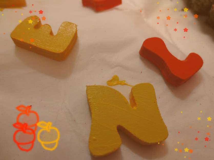 Once your letters are dry enough you don't mind rubbing them all over your clean hands, hot glue them to the board kind of around where you wanted them to be.